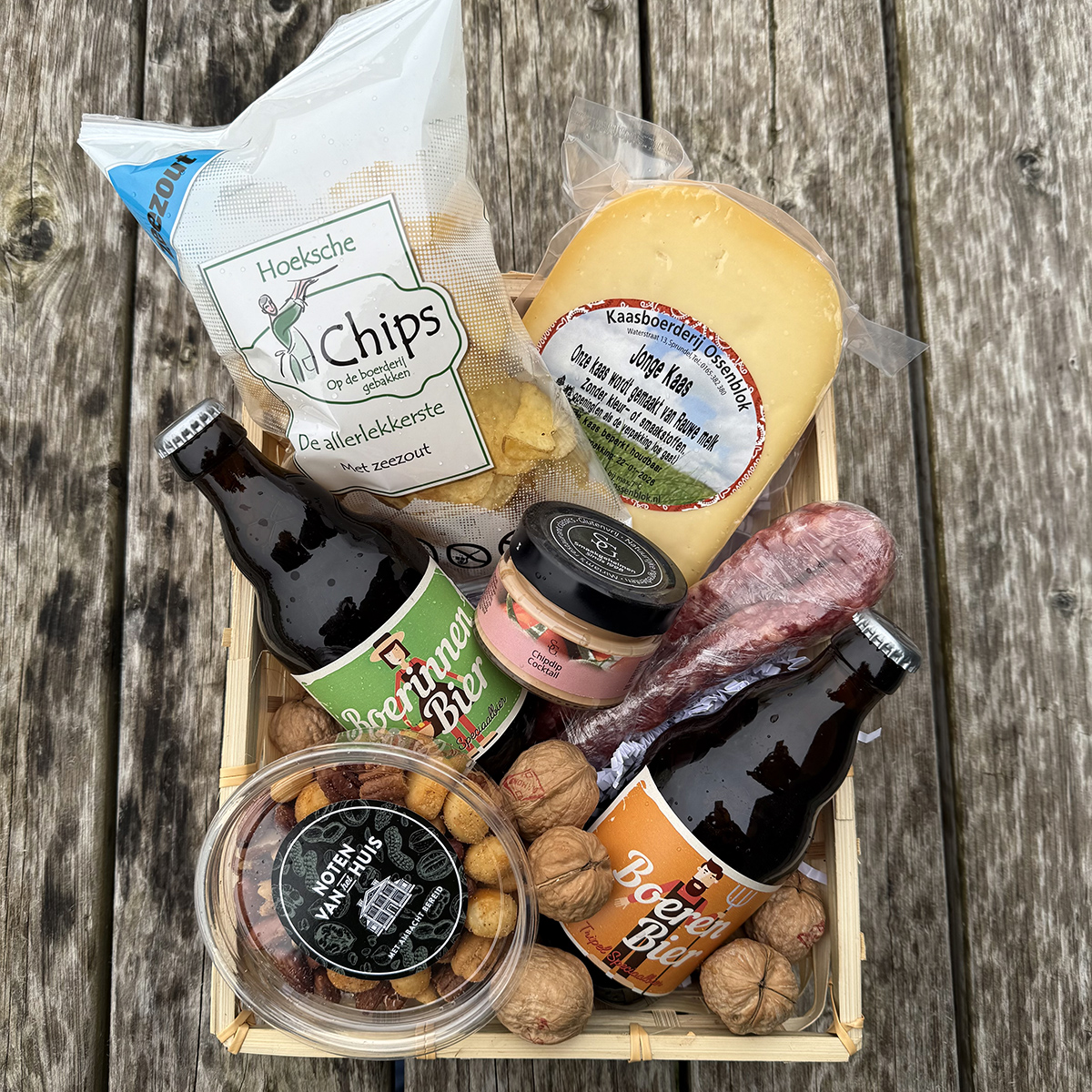 Boeren bier en boerinnen bier, kaas, chips, dipsaus, worst, notenmix.