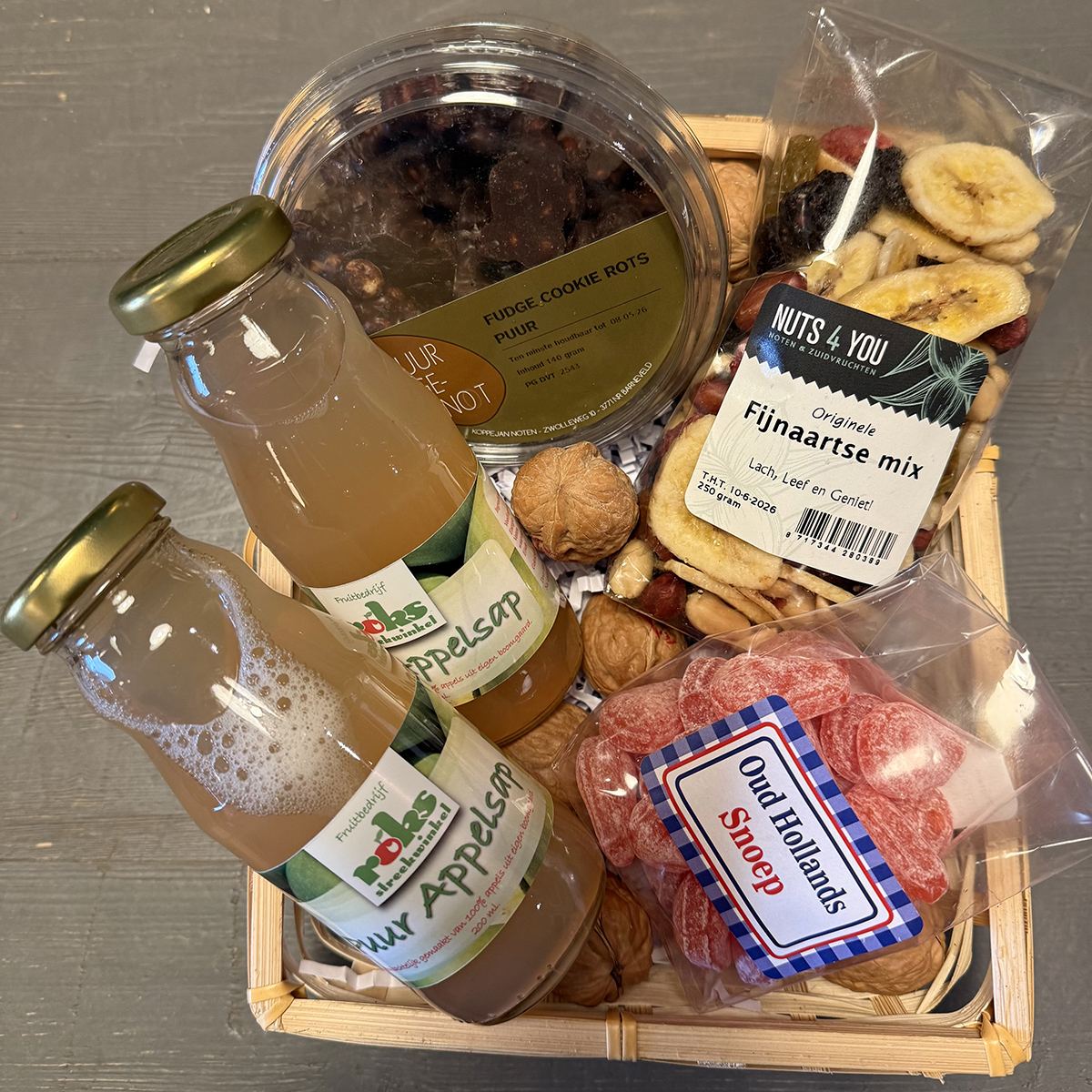 Fudge cookies rots, 2 x appelsap klein, Fijnaartse notenmix, Oud-Hollands snoep.